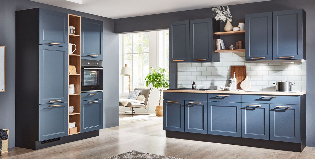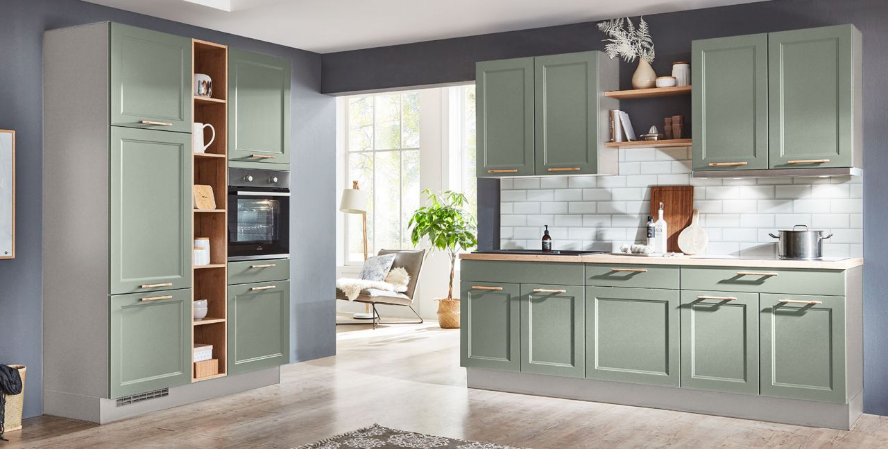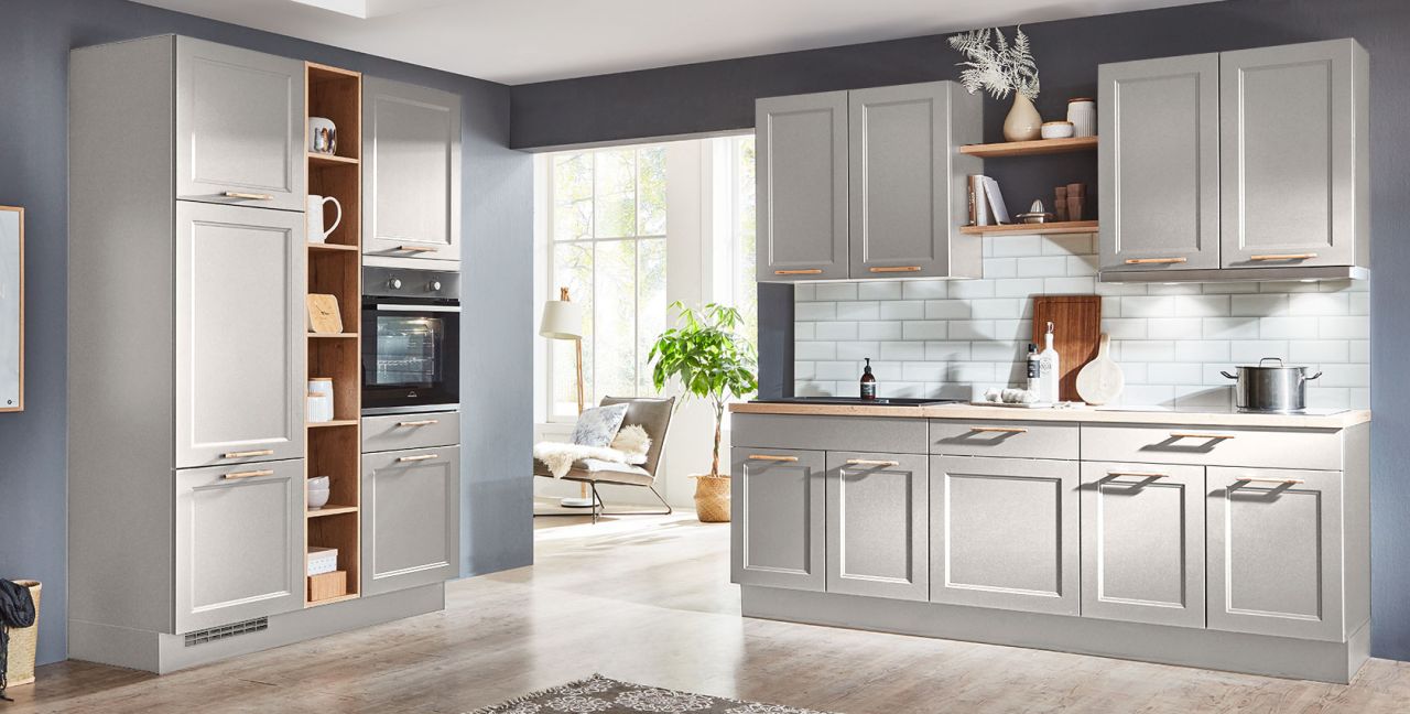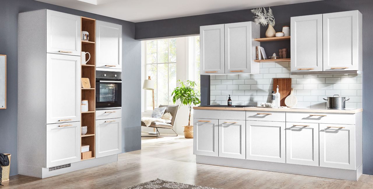 Inklusive Einbaubackofen Edelstahl Progress PBN13002X Energieeffizienzklasse A, Glaskeramik Kochfeld Progress PAS6001E, Flachschirmhaube Progress PDP9040E Energieeffizienzklasse A, Kühlschrank Progress PK0814 Energieeffizienzklasse E, Einbau-Designspüle Elleci Logik 300, Wandborden, Hochschrankregal.